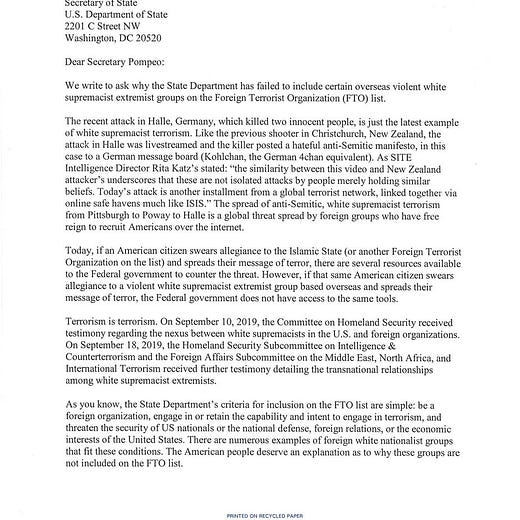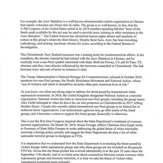On October 16, 2019, the top Democrat on the House Homeland Security Committee’s counterterrorism subpanel, Rep. Max Rose (NY), led a letter signed by forty Democrats asking the State Department why they had not placed Ukraine’s Azov Battalion on the U.S. list of “foreign terrorist organizations” (FTOs).