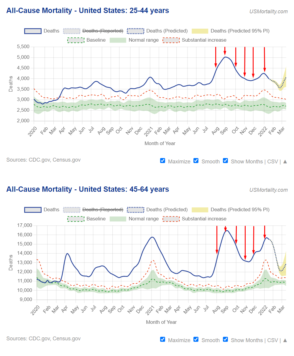 This record increase in death rates among those aged 25-64 which began in July 2021 can be seen in the CDC mortality data charted below from USMortality.com: