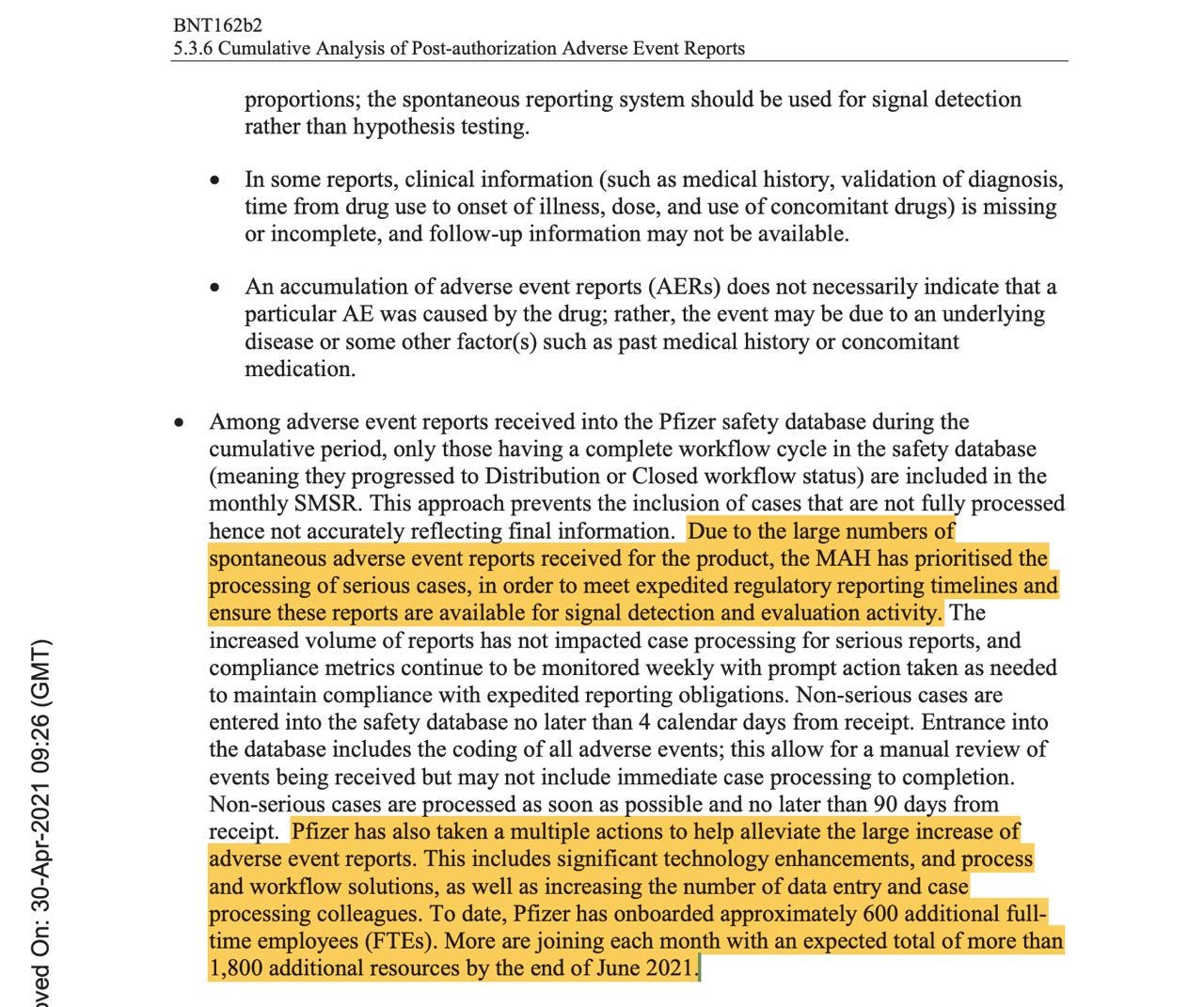 Another tranche of documents released at the end of March revealed that Pfizer had so many adverse events reports in the initial three months after the vaccine rollout that they hired 600 full-time employees just to process the adverse event reports of vaccine side effects, with a plan to hire another 1200 by June 2021.