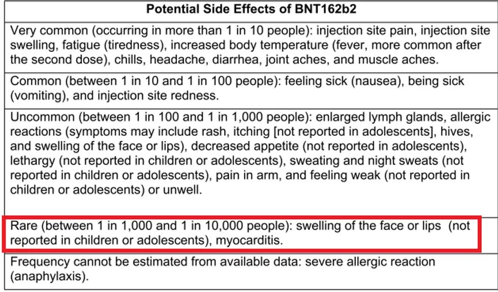 “When it became apparent to the public earlier in 2021 that myocarditis was a known side effect of the shots, the government and the media immediately claimed the incidence rate was exceedingly low. Numerous “studies” tried to downplay the risks. One paper from Kaiser Permanente in JAMA suggested the rate was just 6.6 per million. Another JAMA study from last June found a 1 in 50,000 rate among the military (which we now know was woefully underreported). Well, thanks to ICAN’s FOIA, we now have the Pfizer informed consent document (p. 5) that shows the company recognized the risk can be as high as 1 in 1,000.”
